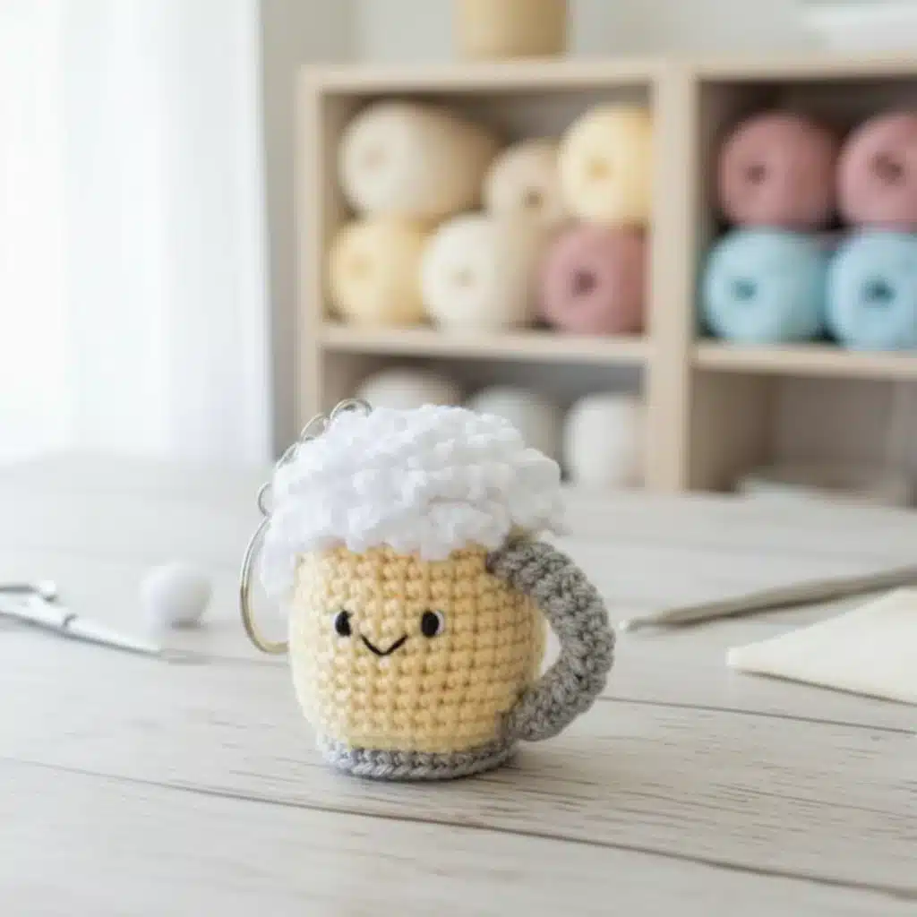 Congratulations on completing your adorable crochet beer mug keychain! This charming little project makes a fantastic gift for craft beer lovers, a quirky bag charm, or a delightful addition to your amigurumi collection. The combination of textured foam, cheerful facial features, and perfectly proportioned handle creates an irresistible miniature accessory.